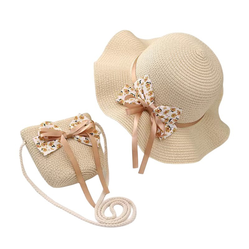 Lányka táska és sapka szett, 52 cm, szalma masni CZ42