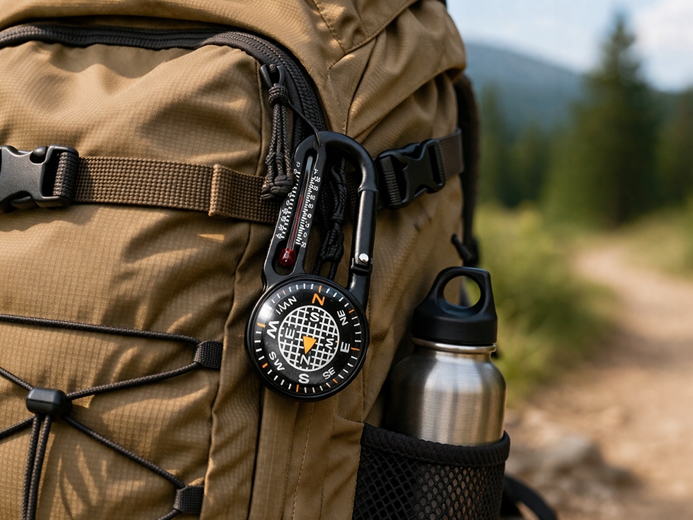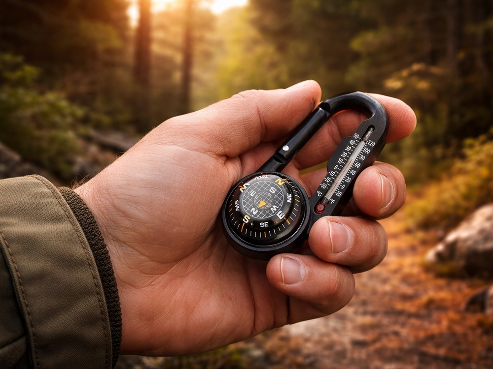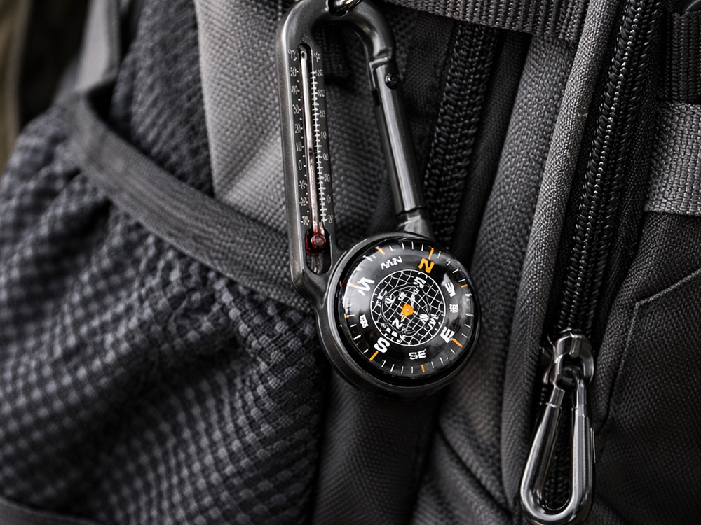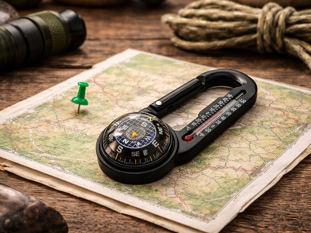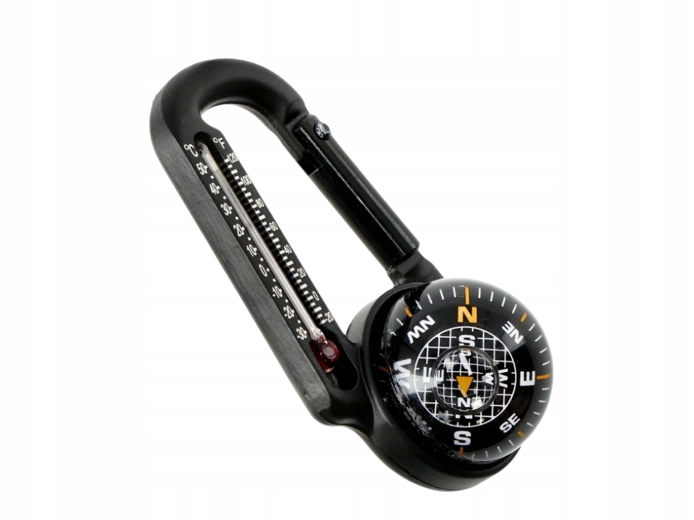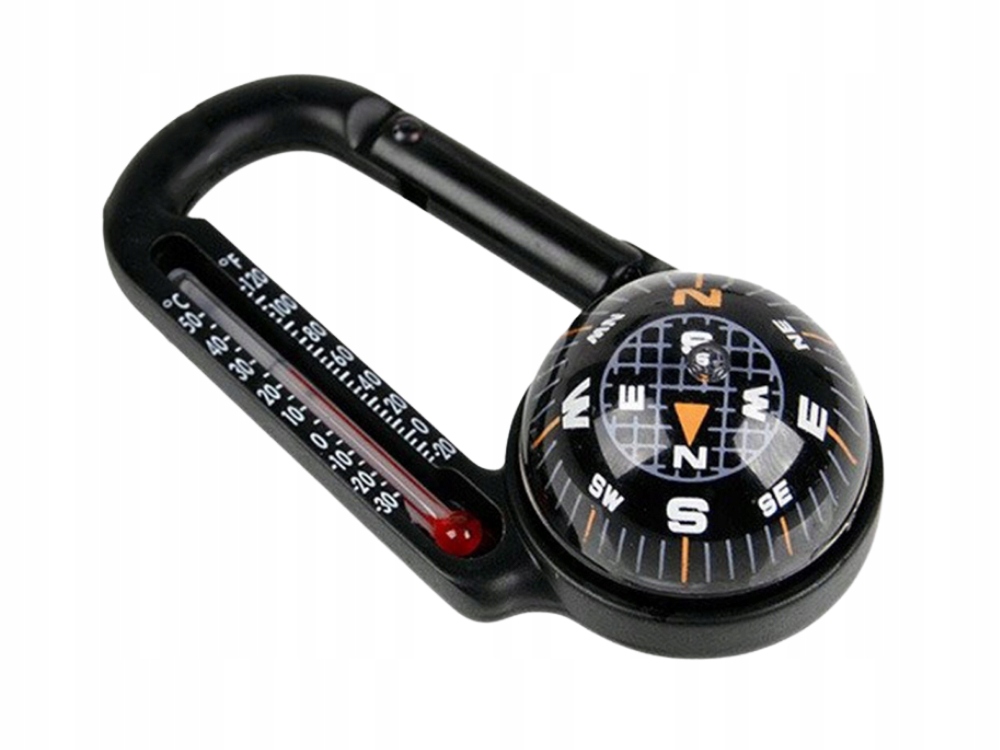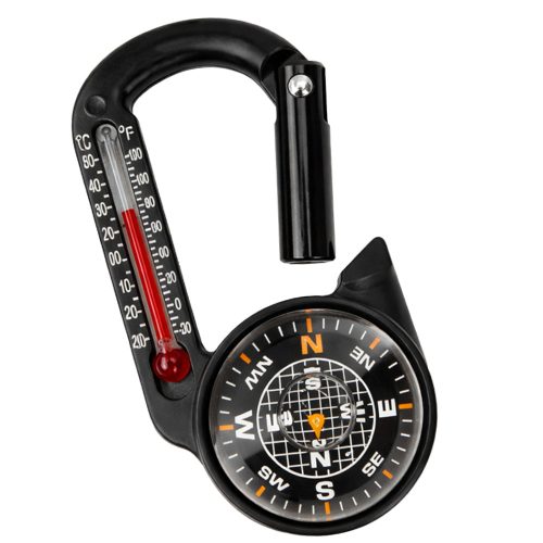 Mágneses iránytű, karabiner, hőmérő, túlélő iránytű, túrairánytű