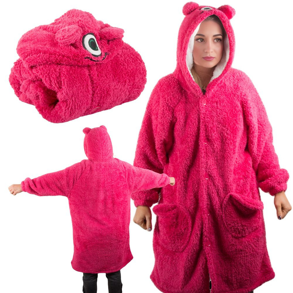 Meleg takaró melegítőpulóver, puha termék, amely egyszerre rendelkezik a köntös és a takaró funkcionalitásával. Meleg anyagból készült, ideális a hideg napokon, az egész testet betakarja. Kapucnija egyetlen szemmel van ellátva, ami játékos, szörnyeteges jelleget kölcsönöz a pulóvernek.