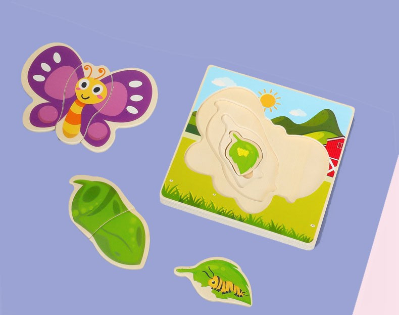 A fából készült, réteges, oktató pillangós kirakó egy Montessori kirakó, amely nemcsak szórakoztat, hanem tanít is.