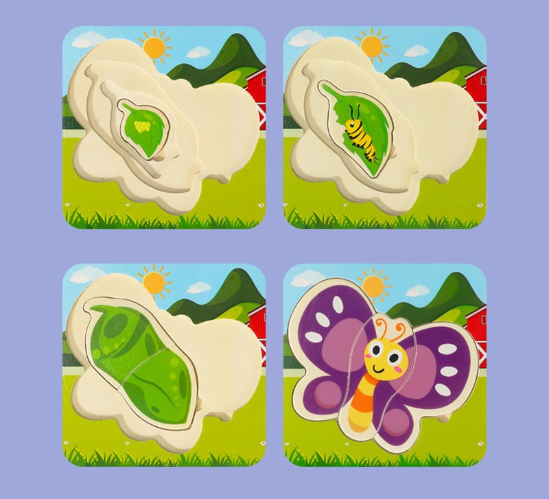 Minden rétegen a gyermek egy másik képet rendez el, aminek köszönhetően megtanulhatja, hogyan fejlődik egy pillangó, a tojástól a Gyönyörű Pillangóig.