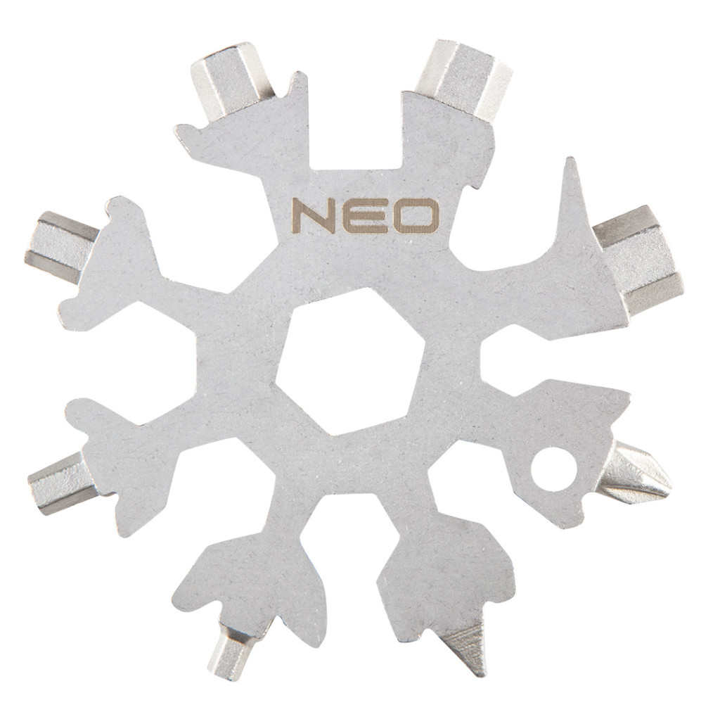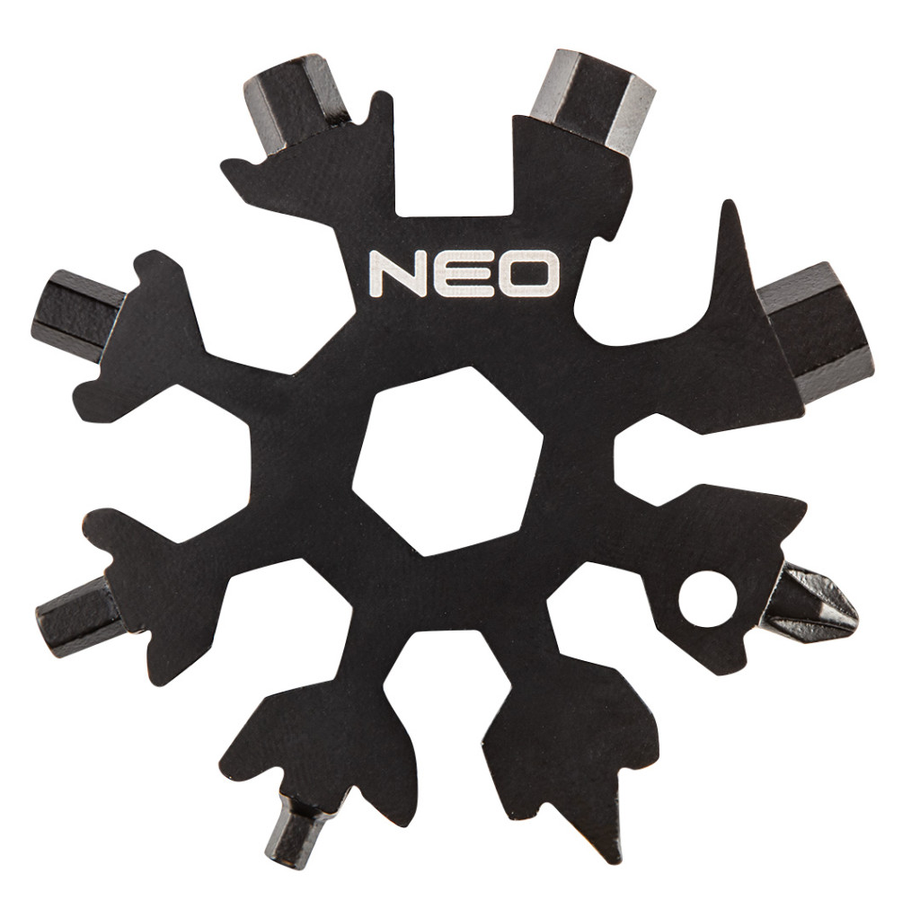 19 az 1-ben NEO hópehely multifunkciós szerszám 2 db (fekete és szürke); funkciók: imbuszkulcs 8, 9, 10, 11, 12, 13, 14, 16 mm; imbuszkulcs 3, 4, 5, 6, 7, 8 mm; csavarhúzó: lapos és Phillips, üvegnyitó; penge dobozok/csomagok vágásához; kulcslyuk; a készlet tartalma: karabíner és gyűrű; anyaga: 420 rozsdamentes acél