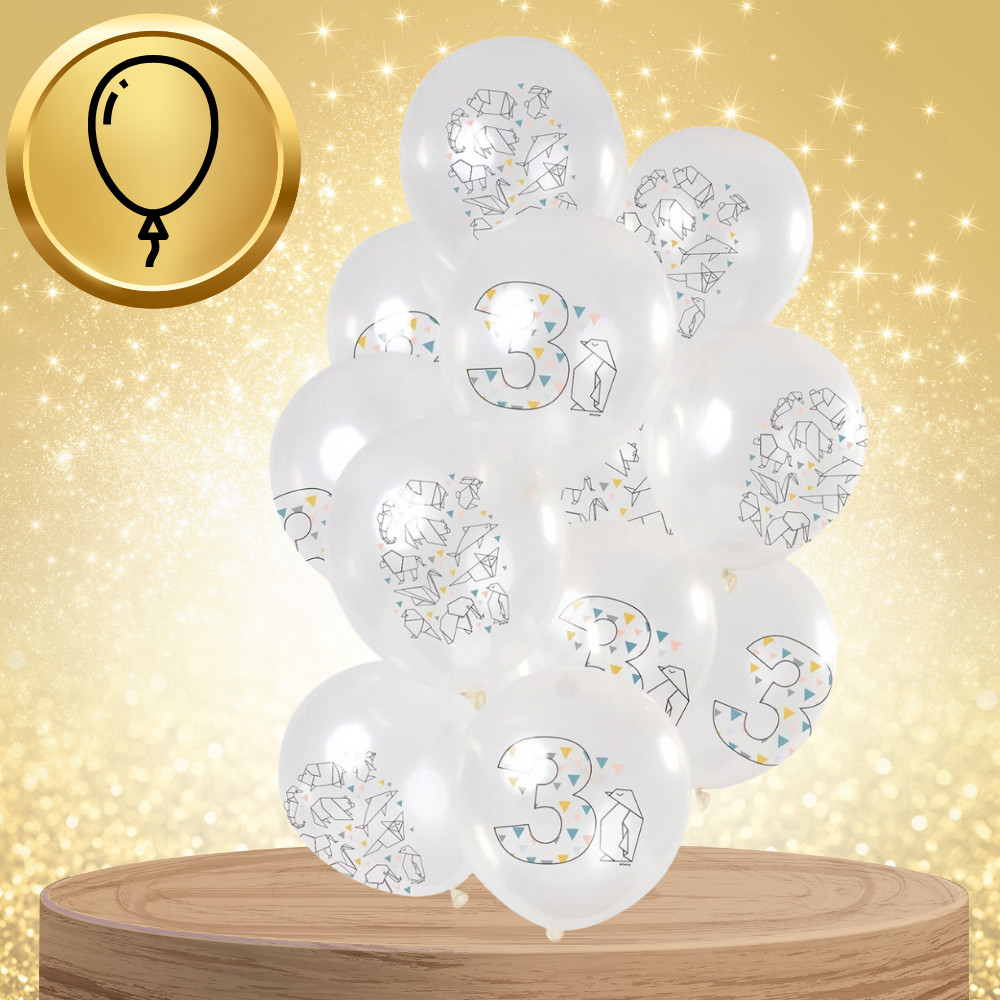 Nagy átlátszó lufik origamival és 3-as számmal, 12 db, fehér