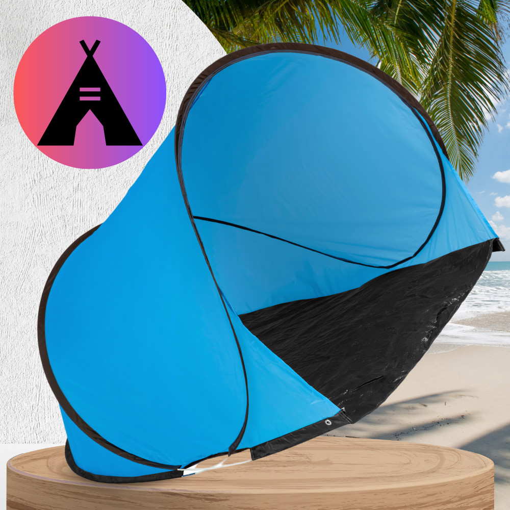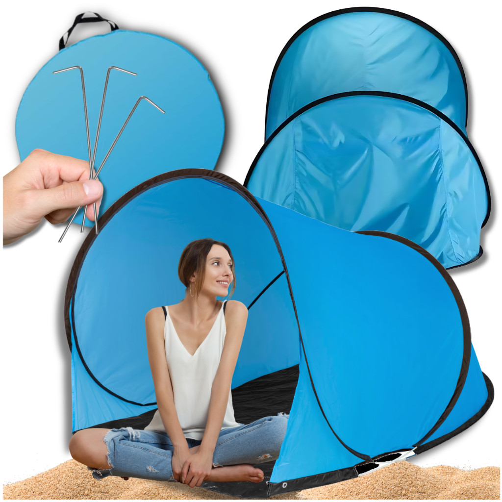 Félig nyitott, POP UP strandsátor - véd a szél és a túlzott napsütés ellen, alulról pedig a nedvesség és a strandon lévő homok ellen. A sátorbevonat kiváló védelmet nyújt a káros UV-sugárzás ellen.