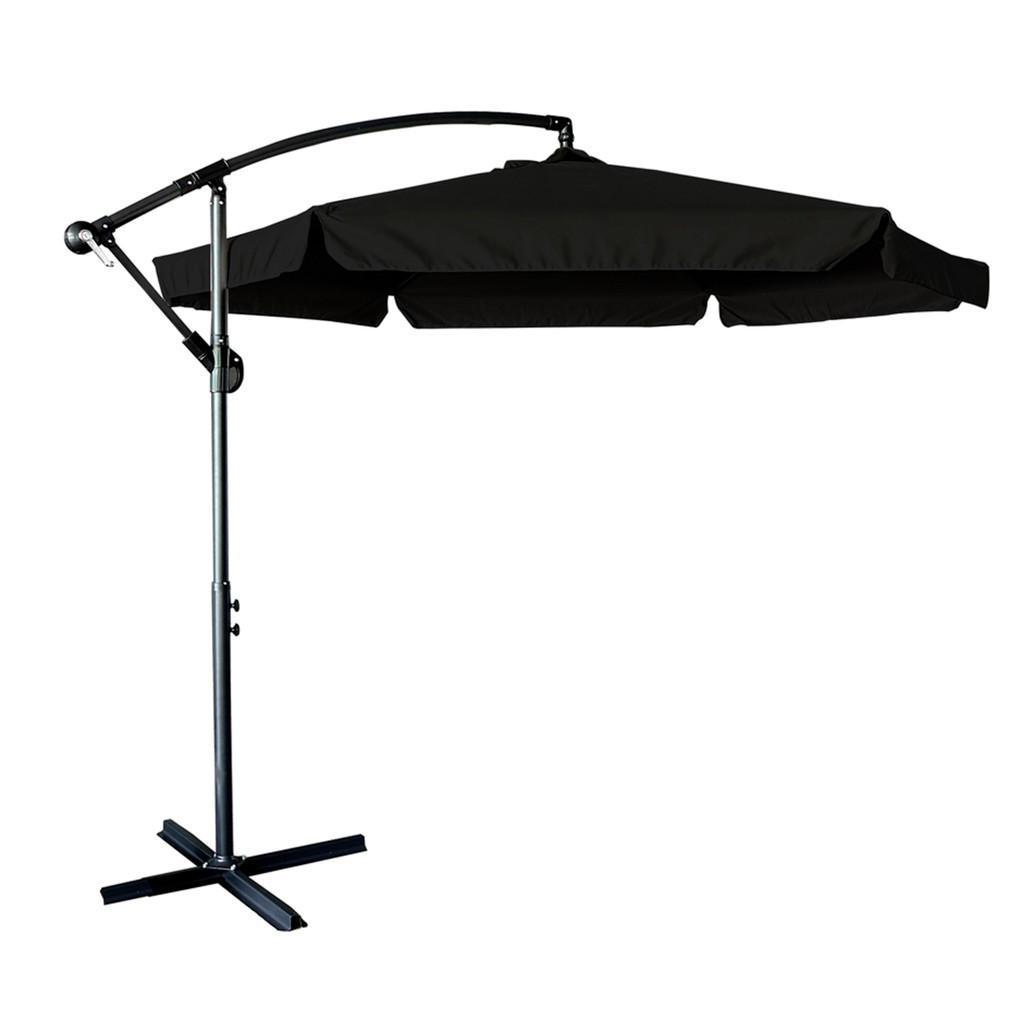 290 cm átmérőjű kerti napernyő kerek fekete tetővel, 6 ágú acélvázzal. 240-287 cm között állítható magasság, forgattyús mechanizmus dőlésszög-állítással, szellőzőrendszerrel és 99 x 99 cm-es kereszttalppal.