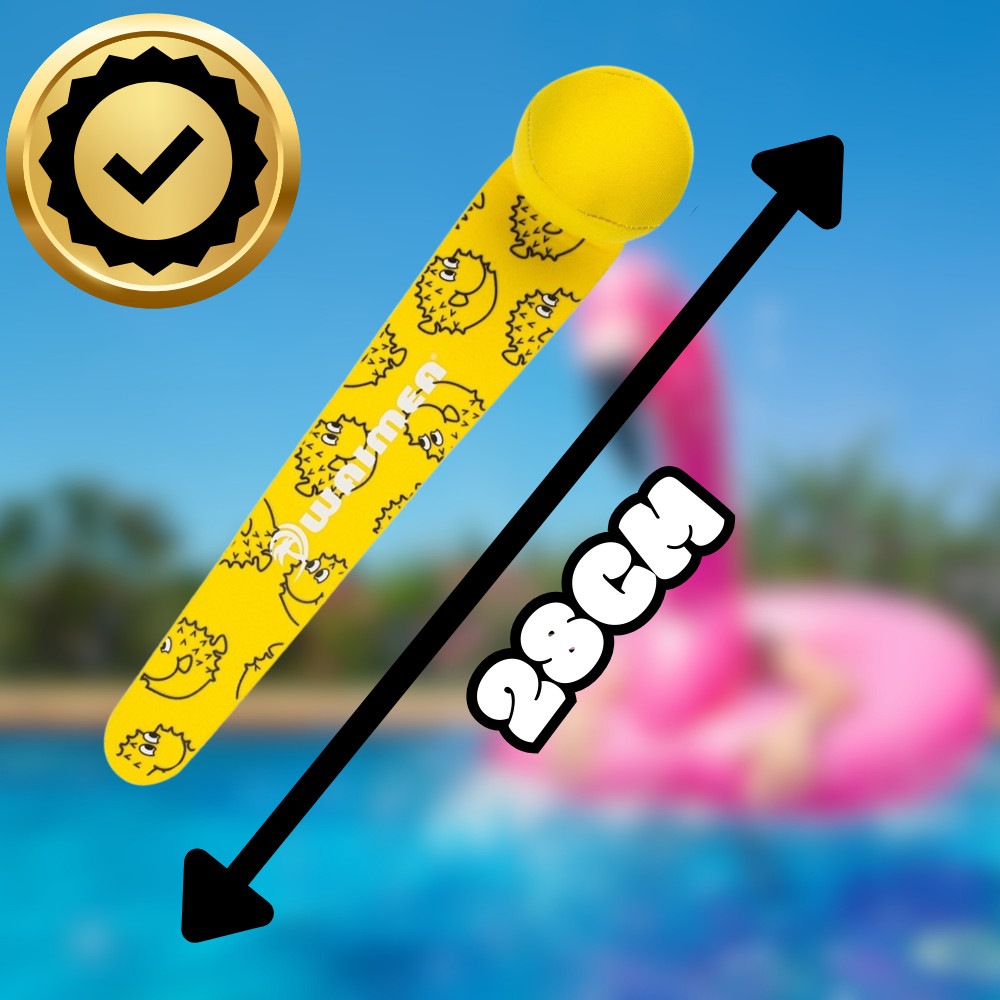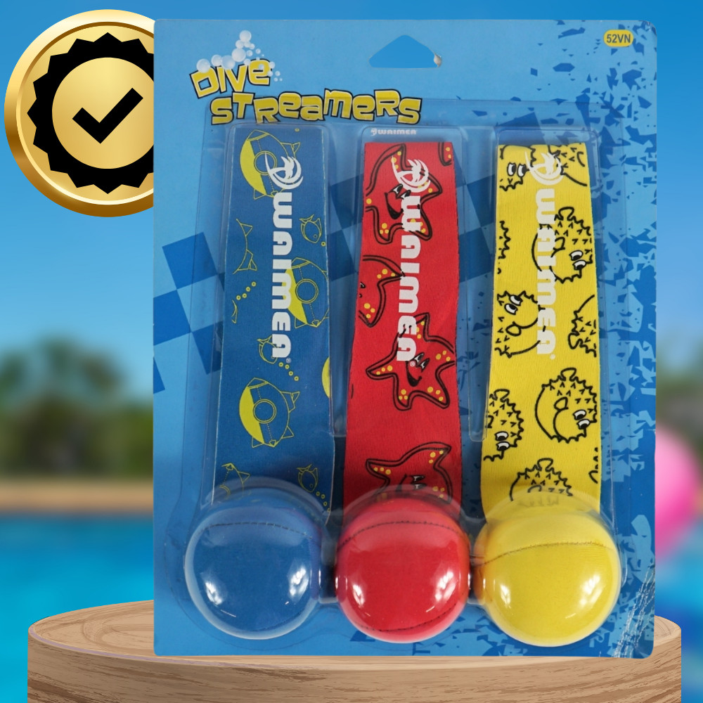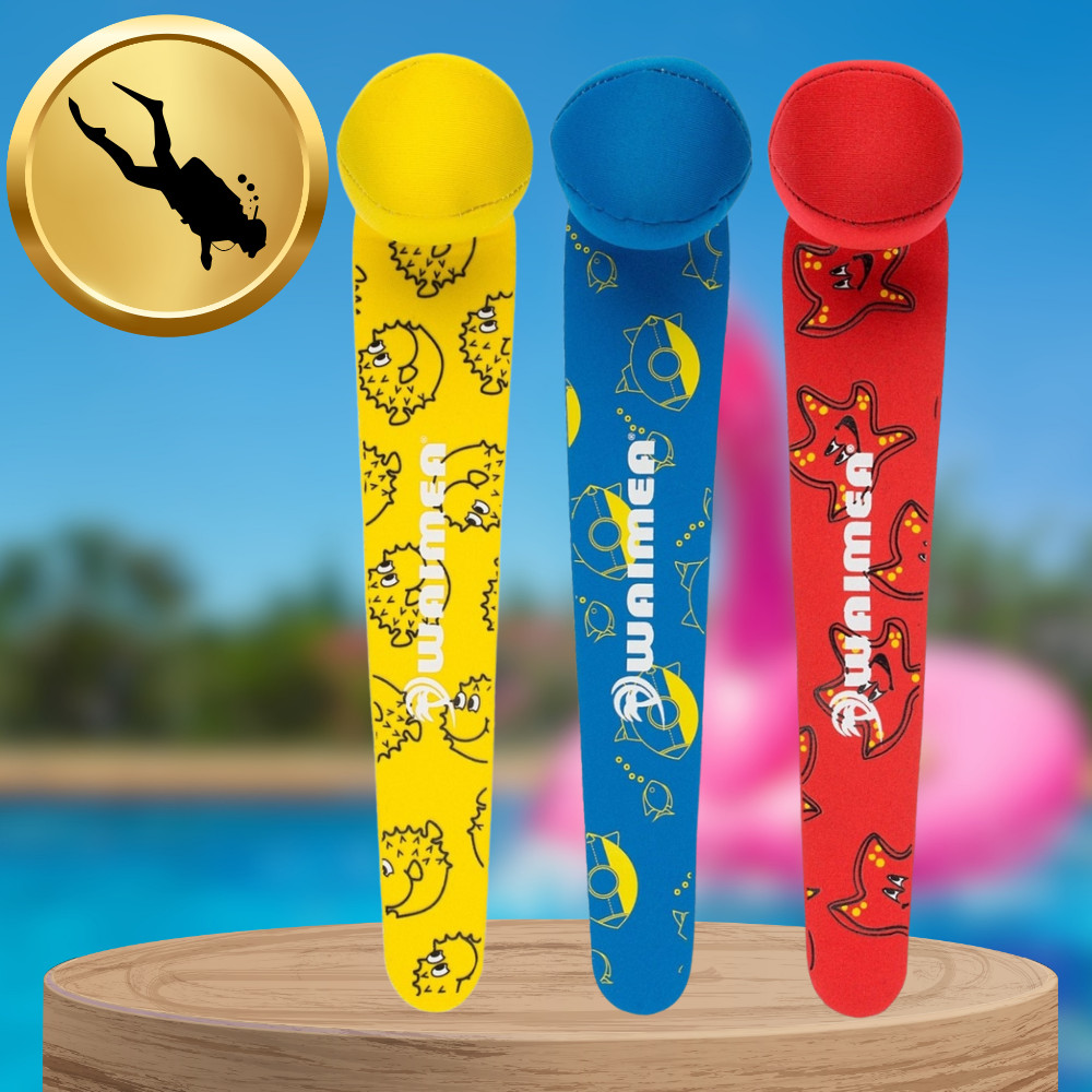✅A három darabos, fogantyús WAIMEA neoprén labdakészlet tökéletes játék az úszás és a búvárkodás tanulásához. Homokkal töltve a botok gyorsan lesüllyednek az aljára, így a gyerekek remekül szórakozhatnak a vízben, miközben búvártechnikákat tanulnak. A készletben található színes botok nagyszerű választást jelentenek a kicsik számára, akik fejleszteni szeretnék vízben való jártasságukat.