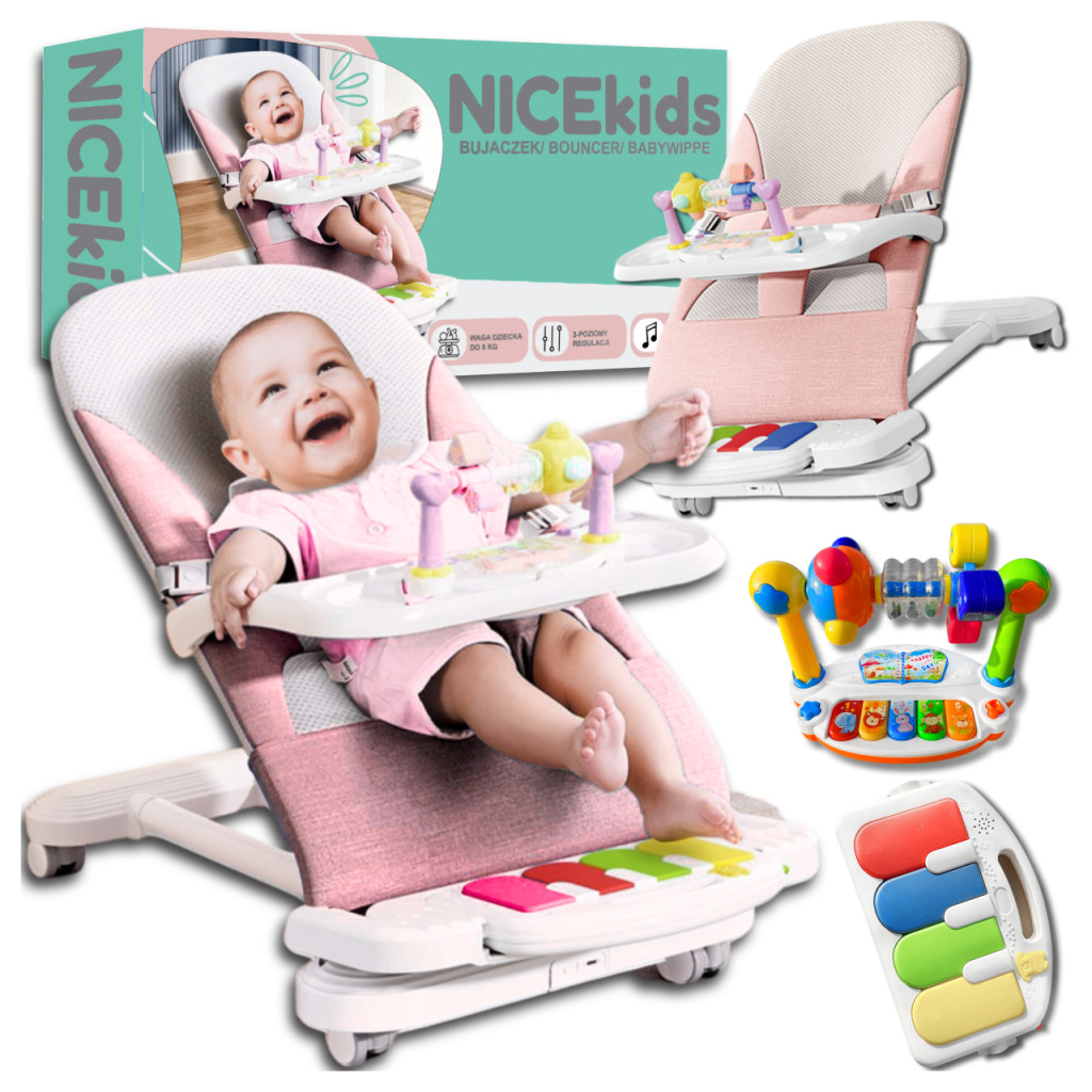 A készlet tartalmaz egy levehető zongorát és zenélő csörgőket, amelyek nemcsak élvezetesebbé teszik a baba idejét, hanem támogatják a gyermek érzékszervi és motoros fejlődését is. A ugrálóvár kiváló minőségű anyagokból készült, biztosítva a kényelmet és a használat biztonságát. Az ülés megfelelően kialakított, biztosítva a baba helyes testtartását.