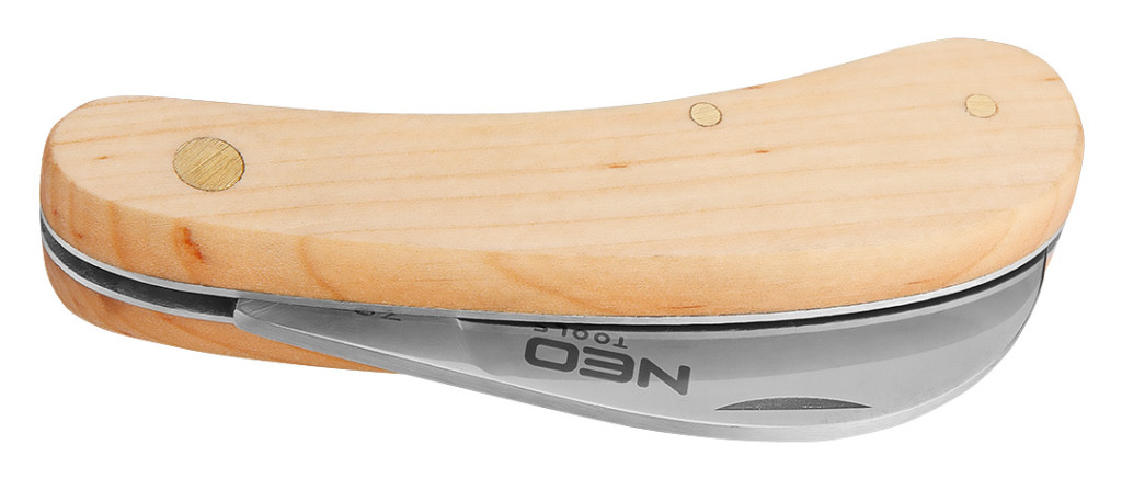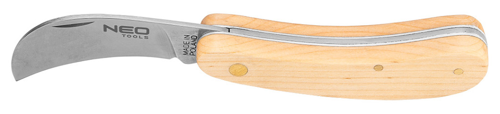 Összeszerelő kés, fa borítású, összecsukható test, teljes nyitott hossz 180 mm, teljes összecsukott hossz 100 mm, pengehossz 80 mm, rozsdamentes acél penge, acél szegecsek, penge résszel a könnyű nyitás érdekében, nyél fa borítással, égerfa típusa, FSC tanúsítvánnyal.