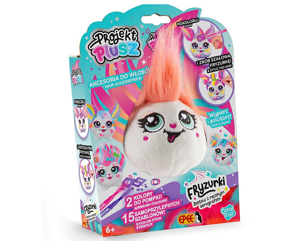 Díszítsd plüssfigurádat az airbrush pumpával. Könnyű! Ragaszd fel a sablont, és a spray-vel fantasztikus mintákat készíthetsz. Még a haját is befestheted, hogy menő frizurát készíts! Játék után pedig csak mosd meg, és kezdd újra.