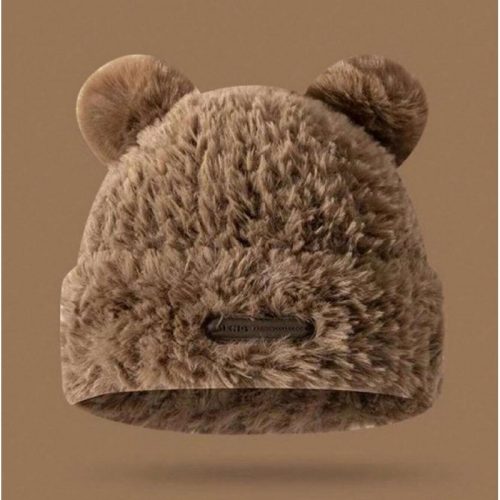 Plüss téli sapka mackó fülekkel, puha és meleg, folttal, barna. Nagyon meleg és rugalmas sapka. Tökéletes téli viseletre. Tökéletes divatos kiegészítőként vagy fejfedőként téli fizikai aktivitáshoz. Méret: univerzális. Összetétel: 100% akril.