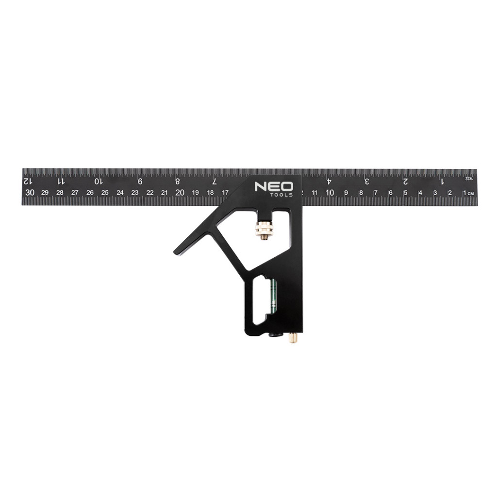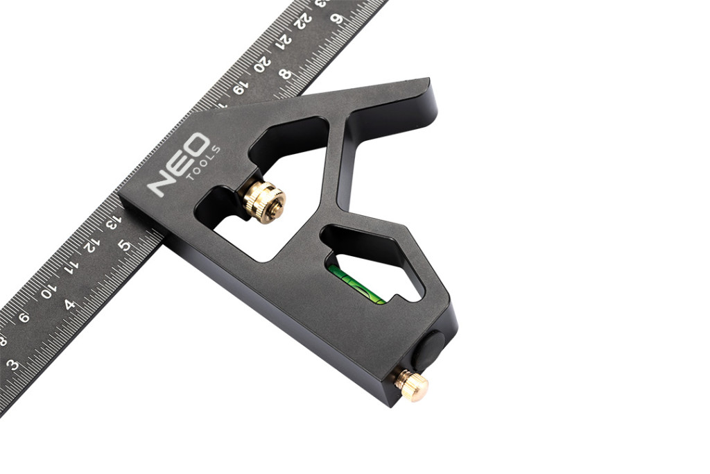 30 cm-es multifunkcionális alumínium derékszögű vonalzó, teljes egészében alumíniumötvözetből, sárgaréz jelölőstifttel és recézett anyával, cm-es és hüvelykes beosztással, tartós, dombornyomott beosztással, vízmértékkel a nyélben