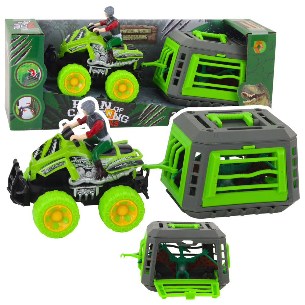 A készlet nemcsak egy masszív quadot tartalmaz rögzített ketreccel, hanem egy védősisakban lévő vezetőfigurát és egy dinoszaurusz figurát is, amelyek együttesen egy koherens jelenetet alkotnak, amely azonnal játékra kész a dobozból kivéve.