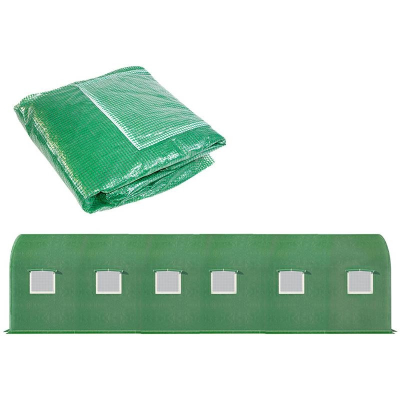 Zöld réteges PE fólia 140g/m2. A fóliaszerkezetbe ágyazott zöld PP háló megerősíti azt és védi a szakadástól és a mechanikai sérülésektől. A zárható, szúnyoghálós ablakok lehetővé teszik a friss levegő áramlását és a páratartalom szabályozását. Az alagút széles, zárral ellátott görgős ajtóval van felszerelve.