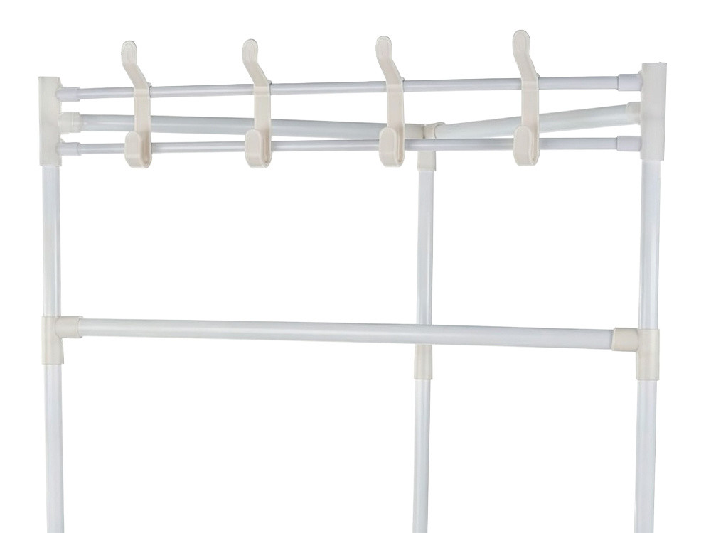A ruhaállvány tartós fémből készült, ami biztosítja a stabilitást és a tartósságot. A felső rész több akasztóval van ellátva ruhák és esernyők tárolásához, míg a három tágas polc ideális kiegészítők, dobozok, törölközők vagy cipők tárolásához. Az egyszerű összeszerelés és a modern kialakítás miatt a ruhaállvány bármilyen belső térhez illeszkedik – a klasszikustól a modernig.