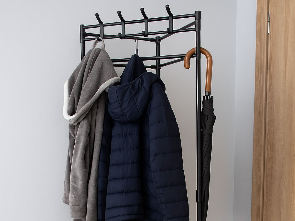 A ruhaállvány tartós fémből készült, ami biztosítja a stabilitást és a tartósságot. A felső rész több akasztóval van ellátva ruhák és esernyők tárolásához, míg a három tágas polc ideális kiegészítők, dobozok, törölközők vagy cipők tárolásához. Az egyszerű összeszerelés és a modern kialakítás miatt a ruhaállvány bármilyen belső térhez illeszkedik – a klasszikustól a modernig.