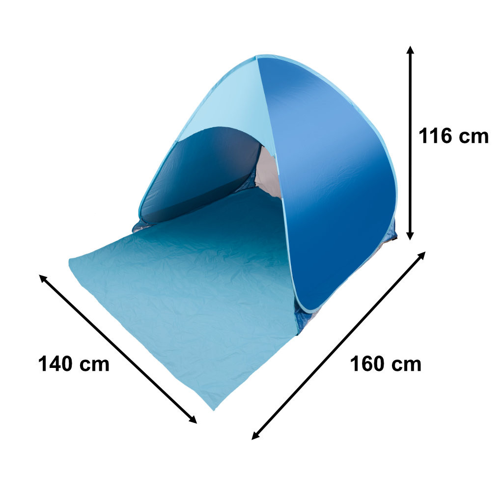 Magasság: 116 cm. Mélység: 110 cm. Hosszabb szövetrész az elején, amely a sátor előre nyúlik: Mélység: 160 cm. Átlátszó háló a sátor hátulján: 50 cm magas. Alap szélessége: 140 x 120 cm. Vízállóság: Igen. Anyag: Poliészter vízálló bevonattal