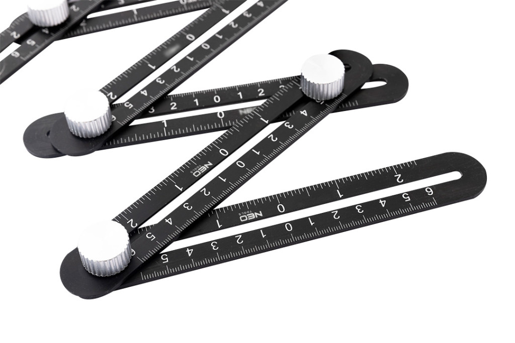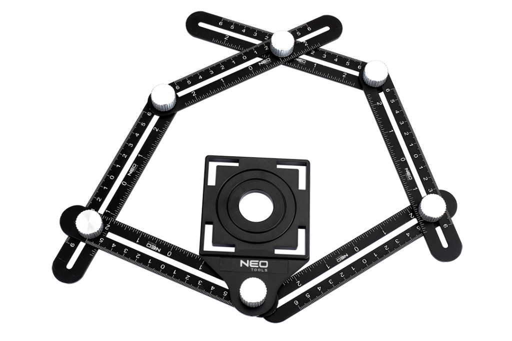 Szögmérő, 6 szárú, alumínium szárak, műanyag (ABS) lyuksablon, hat szárú, 0-6 cm hosszú skálával mindkét irányban (0-2 hüvelyk), lyukméretek: 2,5 cm, 4 cm, 4,5 cm, cm-es és hüvelykes beosztás, esésálló, tartós, alkalmazás: formák másolása és átvitele a következő anyagokkal való munkavégzés során: tégla, fa, csempék, terrakotta, fém stb.