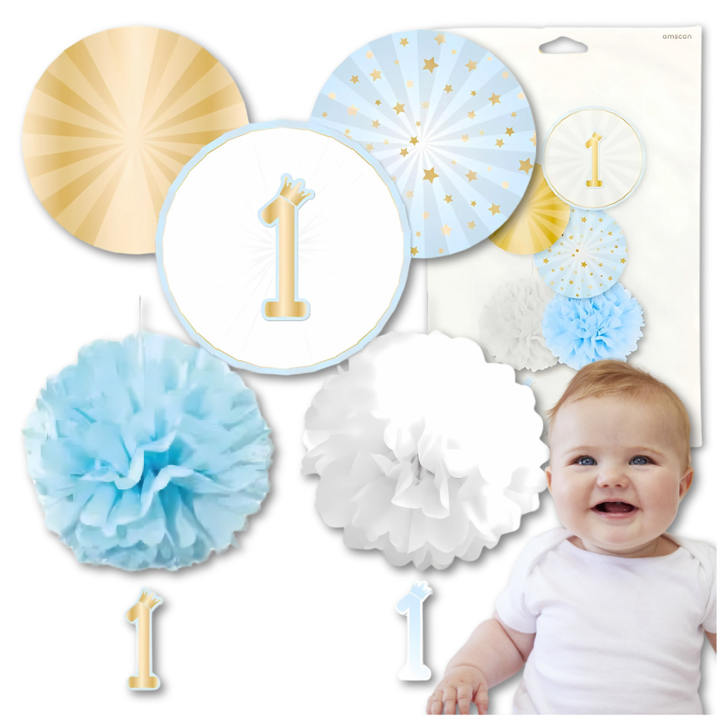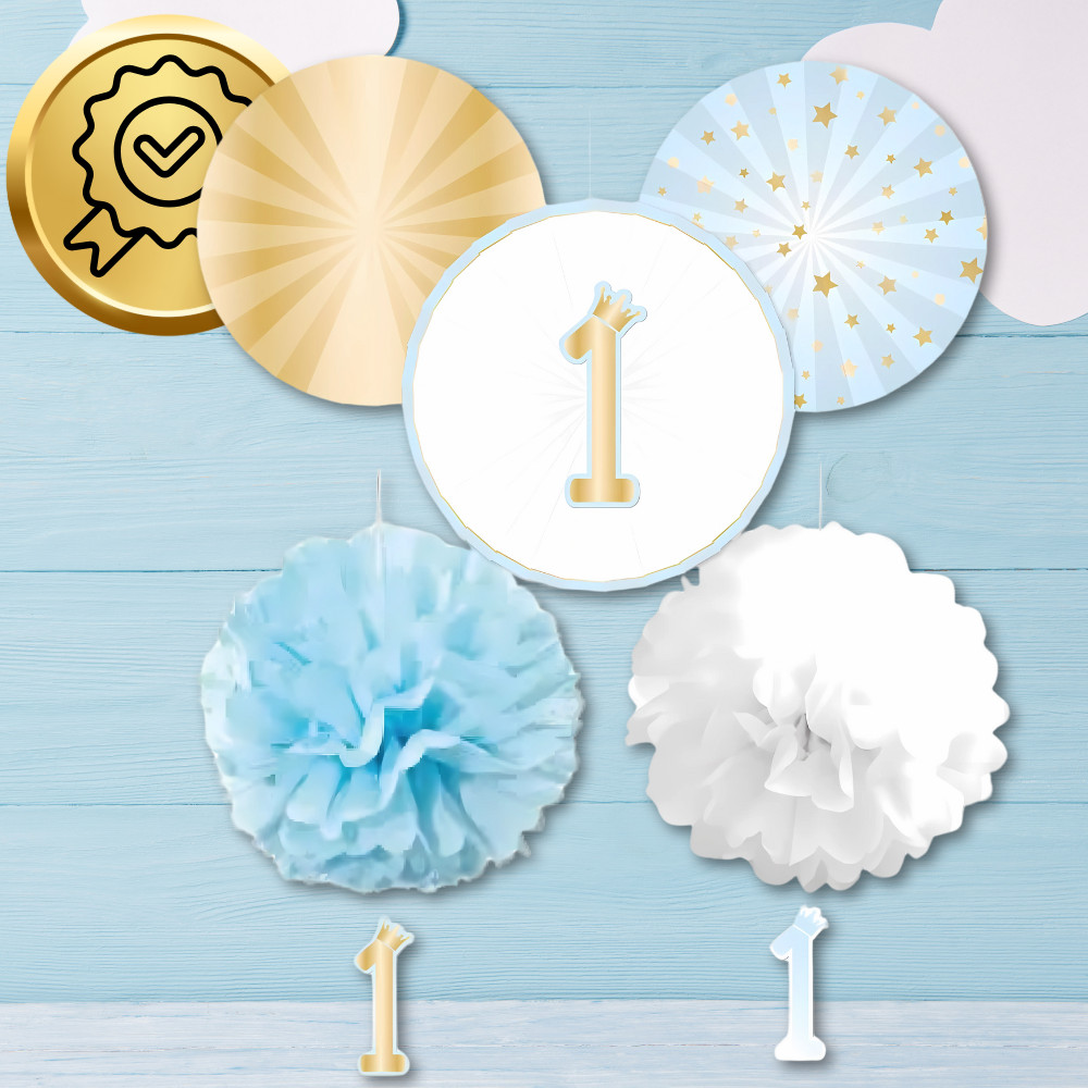 ✅Tedd extra ünnepivé az első születésnapodat ezzel a kék, fehér és arany színű dekorációs készlettel. A készlet öt papír elemet tartalmaz, köztük 40 és 30 cm átmérőjű pomponokat. Tökéletes a gyors és stílusos parti helyszín dekorációjához.