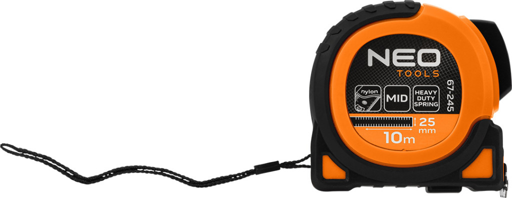 Acél mérőszalag 10 mx 25 mm, automatikus leállítás, 2 szalagtekercselő zár, kétkomponensű ház, matt fekete bevonat a skála kopás elleni védelmére, mindkét oldalon nyomtatott skála, szalagtekercselő csillapító, mágnes, MID tanúsítvány