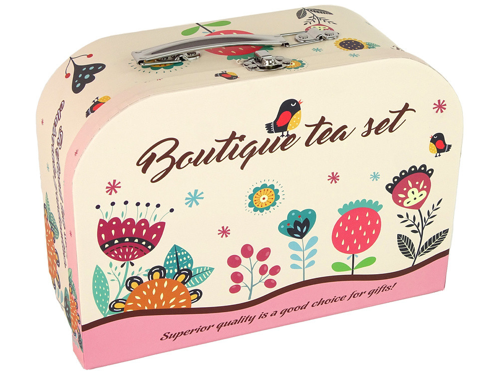 A ládában található egy kávé- és teakészlet, amely kis és nagy csészealjakból, főzőedényből, csészékből és tálcából áll. A készlet minden eleme bájos rózsaszín színű, és érdekes mintákkal rendelkezik, amelyek vonzzák a figyelmet.