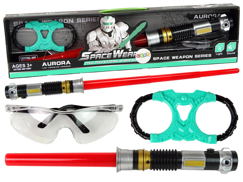 A készlet tartalmaz egy előre nyúló kardot, így akár 80 cm hosszú is lehet. Aktiváláskor olyan hangokat ad ki, mintha egyenesen a galaxisból származna, és fehér fénnyel világít türkizkék borításán keresztül. A biztonsági szemüveg játék közben véd a nyilak ellen. A teljes készlet fekete, ezüst és türkiz színekben van díszítve. Ezeknek a funkcióknak köszönhetően gyermeked képes lesz újraalkotni jeleneteket kedvenc sci-fi filmjeiből!