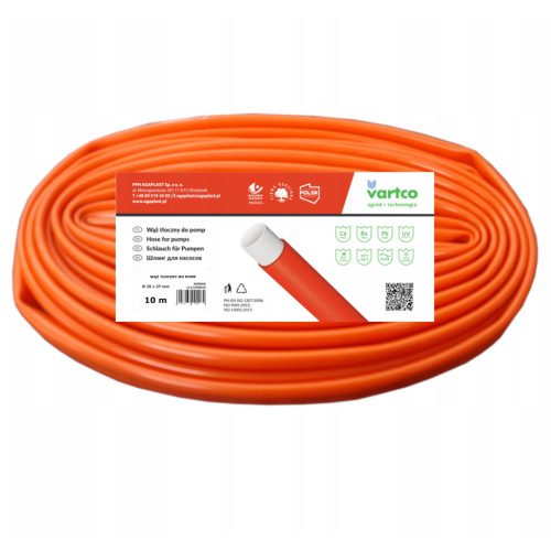 VARTCO szivattyú nyomótömlő víz, folyadékok és szennyvíz szivattyúzására vagy szállítására. 2 rétegű, rugalmas, ellenáll az alacsony és magas hőmérsékletnek. UV- és algaálló. Kadmium-, bárium- és ólommentes. Maximális üzemi nyomás 0,2 MPa. Hossz 10 m, belső átmérő 32 mm.