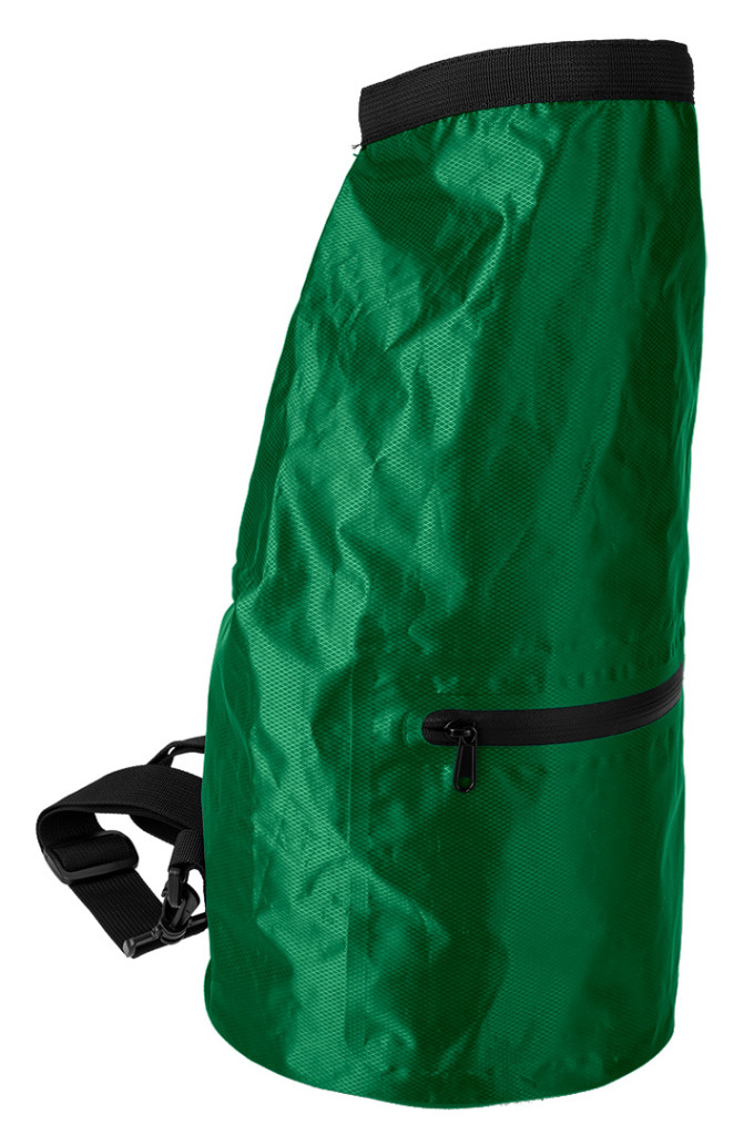 Vízálló táska, 210T nejlon anyagból, IPX4 védelem különböző irányokból érkező fröccsenő víz ellen, akár 10 liter/perc áramlási sebességgel, 15 l űrtartalom, 23 cm átmérő, 48 cm maximális magasság, könnyű és tartós, a fő zseb szorosan záródik, feltekerhető és csattal rögzíthető, további zseb vízálló cipzárral, két levehető, állítható hosszúságú pánt