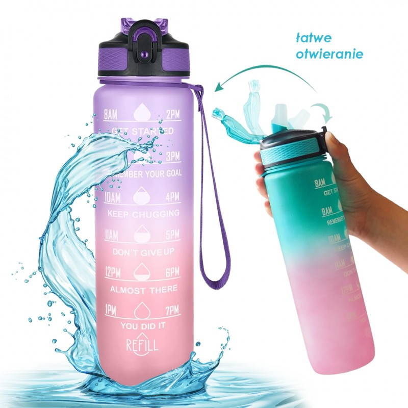 VÍZPALACK Az ivóvíz még soha nem volt ennyire divatos! Specifikációk: - Űrtartalom: 1000ml (átmérő 7,5 cm, magasság a kupakkal 28 cm), - Anyag: PC + PP + szilikon. - A vizespalack szilikon fúvókája levehető szívószálhoz csatlakozik. - Biztonsági zárral rendelkezik, amely megakadályozza a fedél kinyitását és a folyadék kiömlését. - Tartós hordpánttal van felszerelve. Tisztítás: A termék kézzel, meleg, de nem forró vízben mosható. Ne mossa mosogatógépben, ne fagyassza le, ne forralja fel, ne tegye mikrohullámú sütőbe, és ne használjon erős tisztítószereket vagy súrolószereket. Tömeg: nettó 170 g
