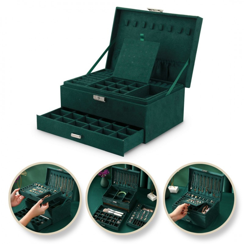 Egy nagyon elegáns és gyönyörű komód gyönyörű zöld színben. Funkcionalitása, számos fiókjával és rekesszel, egyszerű formája rejtőzik, amely tökéletesen kiegészíti mind a modern, mind a retró stílusú enteriőröket. Rendkívül praktikus; nagy mennyiségű ékszert rendszerezhet és védhet a sérülésektől. Gyűrűk, fülbevalók és nyakláncok mind helyet találnak itt. Termékjellemzők: - A gyártás során felhasznált kiváló minőségű anyagok garantálják a minőséget - Rendkívül funkcionális - lehetővé teszi nagy mennyiségű ékszer kényelmes és rendezett tárolását egy helyen - Masszív fém cipzárral rendelkezik - Elegáns, velúr utánzatú anyaggal borított - Belül puha bársony anyaggal töltve. Külső méretek: Magasság - 11,5 cm, Szélesség - 24 cm, Mélység - 17 cm