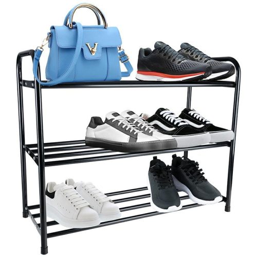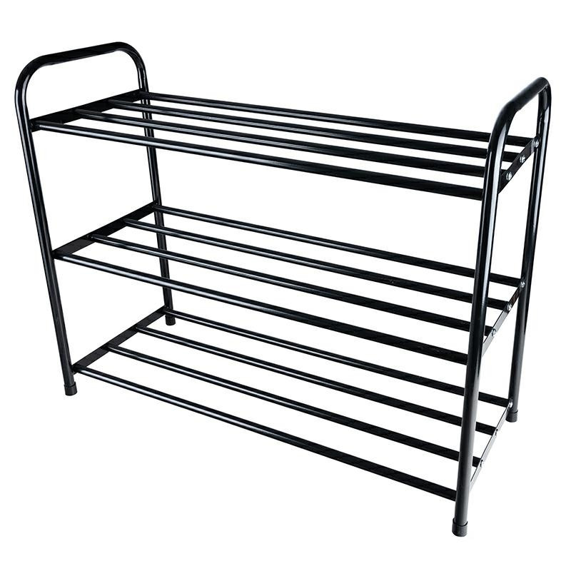 Acél cipőtartó önszerelhető. Megkönnyíti a hely rendszerezését, akár 12 pár cipő tárolását teszi lehetővé. Specifikáció: anyag: acélcsövek méretek (szélesség / mélység / magasság): 66x26x52cm 3 szint maximális polcterhelés: 4kg csomagolás méretei: 68x28x4cm raklapon lévő mennyiség: 160 db