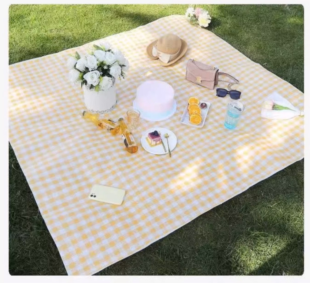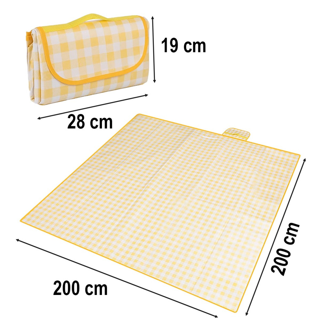 Piknik, strandtakaró, kempingszőnyeg, vízálló, hordozható, nagy, 2x2m, sárga, kockás