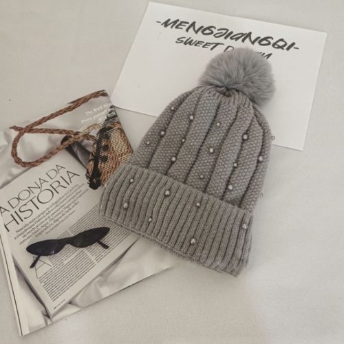 Kötött téli sapka pomponnal és gyöngyökkel, szürke CZ36WZ2
