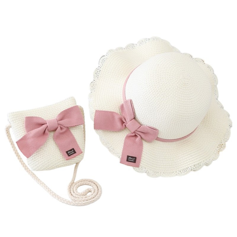 Lányka táska és sapka szett 52 cm, szalma masni CZ43