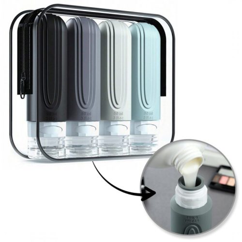 UTAZÓ PALACK KÉSZLET: Ez a 4 darabos szilikon palackkészlet kifejezetten kozmetikumok utazás közbeni hordozására készült. A szorosan lezárt palackok megakadályozzák a véletlen kifolyást a bőröndben vagy utazótáskában. Specifikációk: Magasság: 13 cm Űrtartalom: 90 ml A készletet tartalmazó tasak méretei: 16 cm x 13,5 cm x 4 cm Tömeg: 150 g nettó / 185 g bruttó