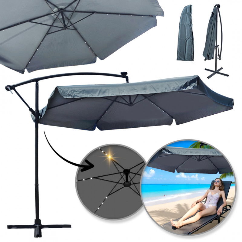 Kerti napernyő konzolos karral + LED napelemes lámpákkal. Ez a kerti napernyő tökéletes választás azok számára, akik megbízható napvédelmet keresnek! A maximális funkcionalitást és kényelmet szem előtt tartva tervezték, nemcsak árnyékot, hanem védelmet nyújt a káros UV-sugárzás ellen is. Specifikációk: - Az napernyő tetője ellenáll a szélnek, az esőnek és a napnak (UV50+ szűrő). Az anyag vízálló. - Az napernyő a legmodernebb magasság- és dőlésszög-állító rendszerrel rendelkezik. - Masszív váz és 8 erős borda. A kiváló minőségű kidolgozás tökéletessé teszi az napernyőt még kedvezőtlen időjárási körülmények között is. - A termék összecsukható, kibontási módszer: tekerőkar. - Beépített SOLAR LED lámpák. Az napernyő világítását napenergia biztosítja a mellékelt napelemes tápegységnek köszönhetően. Ennek köszönhetően az napernyő nem igényel hálózati csatlakozást. Anyag:- Borítóanyag: 100% poliészter, grammsúly 180 g/m2- Váz anyaga: acélKonstrukció:- 6 acél borda 12 x 18 mm- Acéloszlop 48 mm- Talp: keresztMéretek és súly:- Védőburkolat átmérője: 300 cm- Magasság: 262 cm- Váz: bordák: 12x18 mm, oszlop átmérője 48 mmSúly: 15 kgCsomag méretei: 198 cm x 32 cm x 15 cm