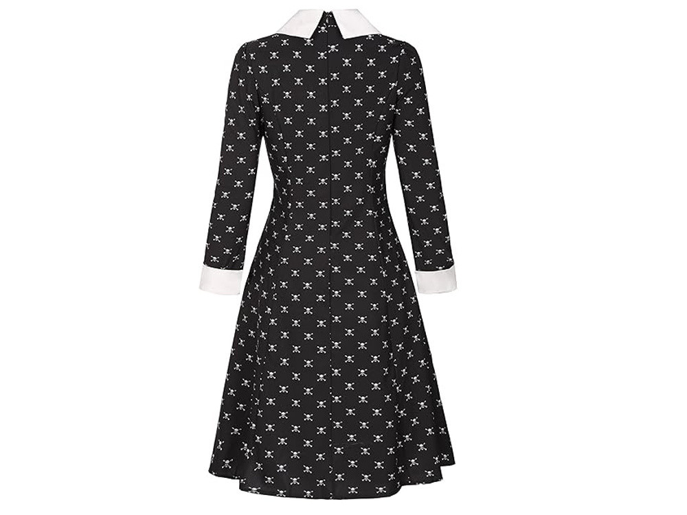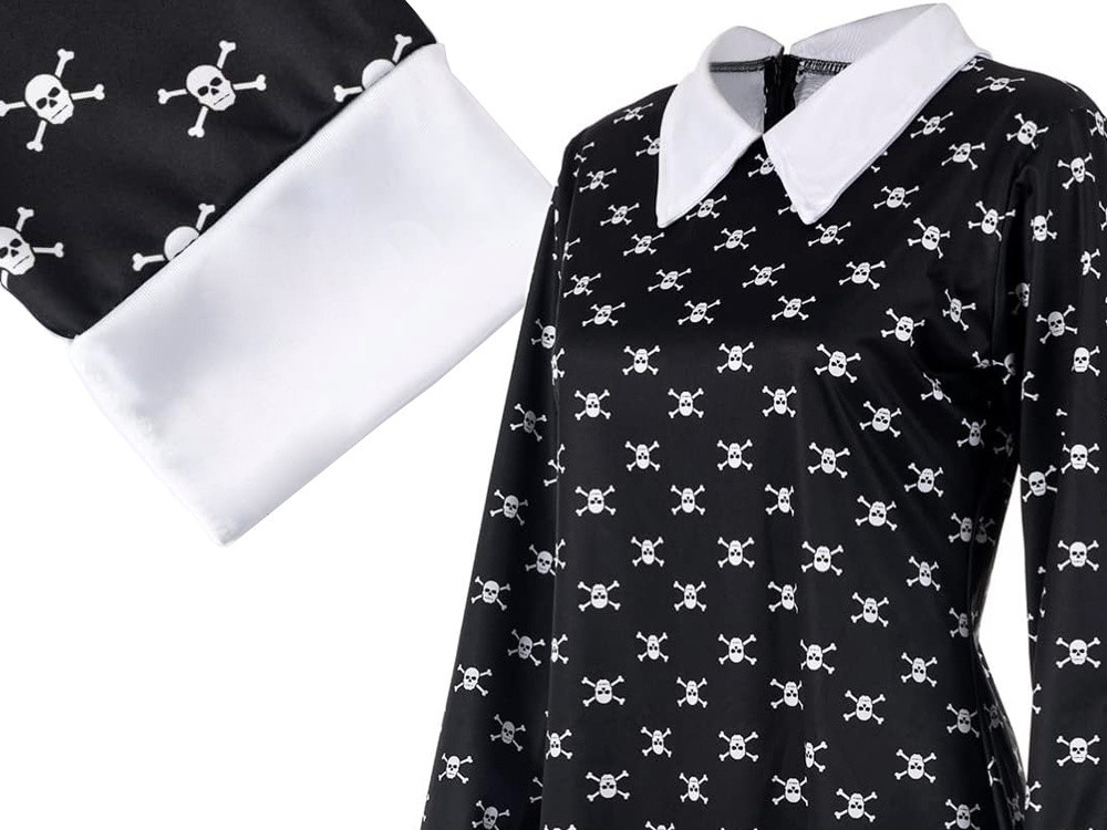 A fehér, széles gallér a ruha kulcsfontosságú eleme,amely éles kontrasztot képez a feketével. Klasszikus szabásával a gallér utal Wednesday egyedi stílusára, eleganciát és karaktert kölcsönözve neki.