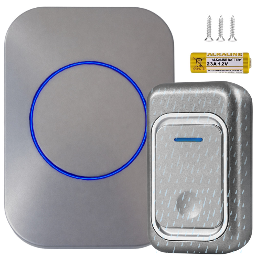 Vezeték nélküli ajtó- és kapucsengő, 300 m hatótávolság, led-es, elemes, vízálló szürke